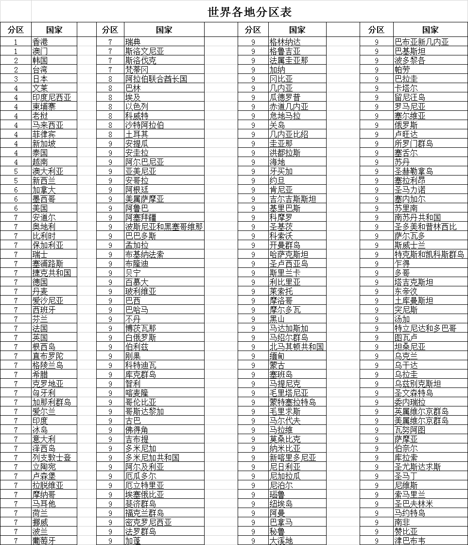 | 重量 區(qū)域 | 1 | 2 | 3 | 4 | 5 | 6 | 7 | 8 | 9 |